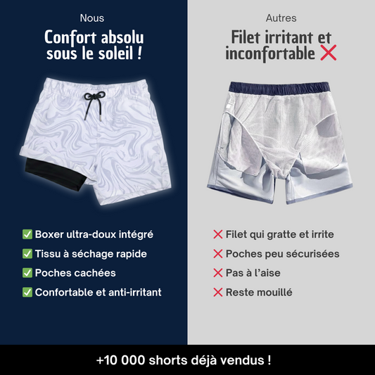 Doublure douce type boxer, sans filet irritant. Séchage rapide. Poche intérieure discrète pour votre téléphone.